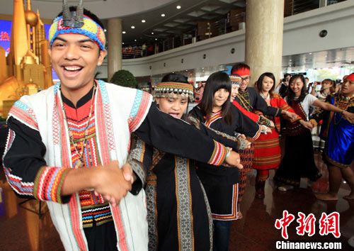 10月10日,70多位來自臺灣8個少數(shù)民族的世博參訪代表,在上海城市規(guī)劃展示館載歌載舞,參加上海市海峽兩岸交流促進(jìn)會舉行的 “2010臺灣少數(shù)民族世博參訪團(tuán)”歡迎儀式。參訪團(tuán)在游覽上海世博會后,還將與上海大學(xué)生交流等。 中新社記者 潘索菲 攝