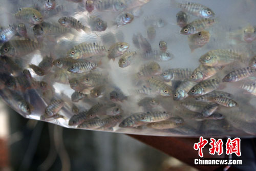 28日,海南省政府支持企業(yè)水災后恢復生產(chǎn)的的第一批羅非魚魚苗,在?谌r(nóng)場三江灣萬畝羅非魚示范基地臺資海南新海洋水產(chǎn)有限公司養(yǎng)殖基地投放,半年后有望出產(chǎn)品。關向東 攝