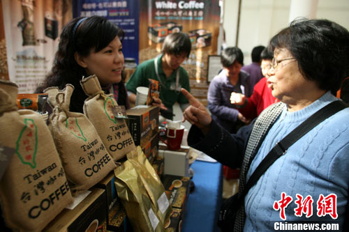 11月3日,北京市民在“中華老字號(hào)博覽會(huì)”上品嘗臺(tái)灣咖啡后,向工作人員描述“臺(tái)灣味道”。“中華老字號(hào)博覽會(huì)”于近日在北京全國(guó)農(nóng)業(yè)展覽館開幕,包括港臺(tái)地區(qū)在內(nèi)的各地知名老字號(hào)企業(yè)共270余家集中亮相。