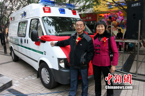 臺(tái)胞羅文璋的胞弟羅洪俊夫婦在捐贈(zèng)的救護(hù)車前合影 作 者:廖小兵