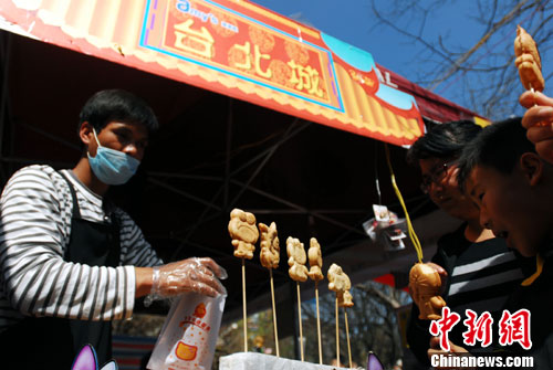 春節(jié)期間,臺灣特色美食小吃聯(lián)展在昆明翠湖公園舉辦,給市民帶來了地道獨特的臺灣風(fēng)味。據(jù)了解,經(jīng)營臺灣美食的店主都是地道的臺灣人,此次旨在讓市民品嘗最正宗的臺灣特色美食。圖為臺灣卡通小蛋糕特別受小朋友喜愛。