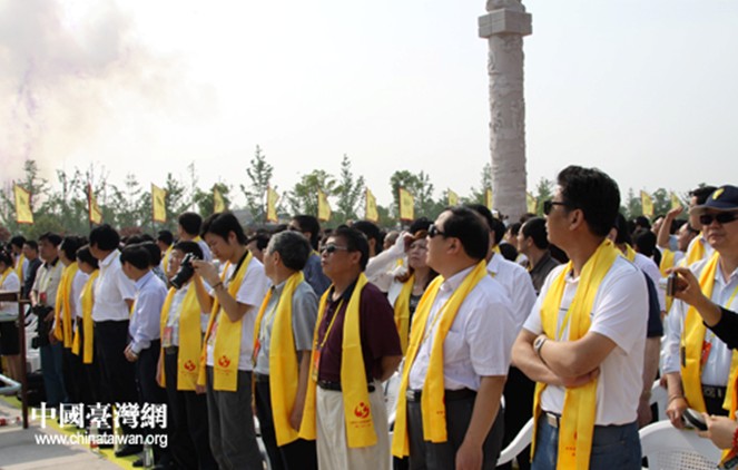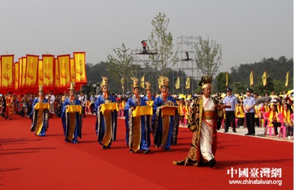 圖為由唐國強(qiáng)擔(dān)任主奉司官的奉祀方陣。唐國強(qiáng)手捧《奉祀祝辭》,神情肅穆,氣度非凡。緊隨其后的8位能士,他們手捧象征炎帝“八德”的禮器,神情蕭肅,充滿著對華夏始祖無限的崇敬。(中國臺灣網(wǎng) 徐維彬 攝)