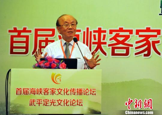 中華海峽兩岸客家文經(jīng)交流協(xié)會(huì)秘書長(zhǎng)、臺(tái)灣世新大學(xué)教授黃肇松作了題為“加大定光文化傳播,推動(dòng)客家文化遠(yuǎn)播”的主旨演講。 張斌 攝