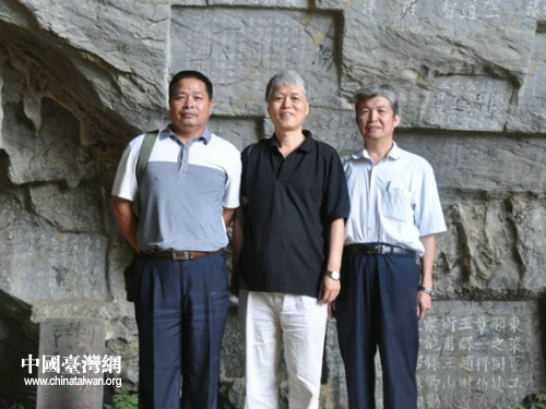 英德政協(xié)文史委林超富主任與兩位教授在碧落洞摩巖石刻前合影(圖片來源:英德市臺辦)