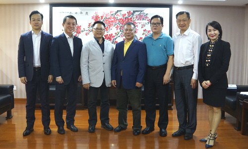 廣東省臺辦主任黃耿城(中)、副主任方濤(右三)與臺灣工商團(tuán)體秘書長聯(lián)誼會秘書長黃章富(左三)、中國信托商業(yè)銀行廣州分行行長林福源(左二)一行合影。