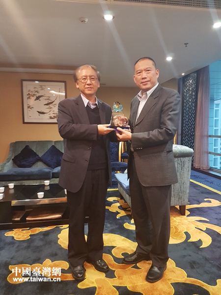 中山市臺灣事務(wù)局局長林慶和(右)會見臺灣中山大學(xué)中國與亞太區(qū)域研究所林德昌教授(左)師生一行并互贈紀念品。(圖片來源:中山市臺辦)