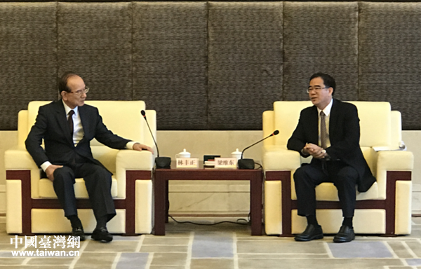 圖為東莞市委書記梁維東(右一)會見國民黨榮譽副主席林豐正(左一)現(xiàn)場。