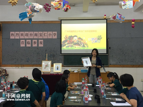 臺(tái)南寶仁小學(xué)師生團(tuán)體驗(yàn)越秀區(qū)少年宮通草畫課程。(圖片來(lái)源:廣州市臺(tái)辦、越秀區(qū)臺(tái)辦)