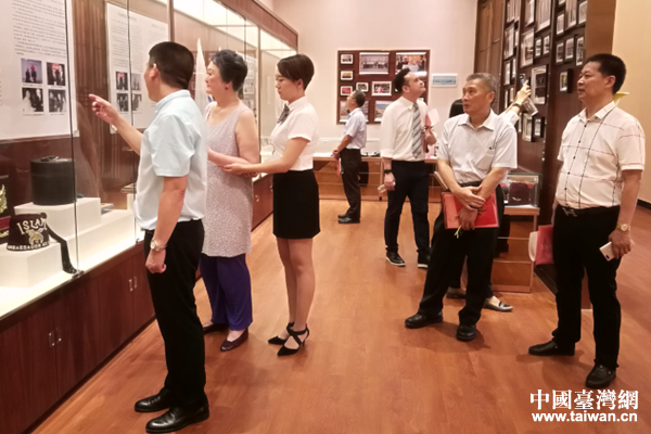 臺(tái)胞徐燕女士(左中)與兒子霍偉強(qiáng)(右三)在廣州市臺(tái)協(xié)會(huì)長王治中(右二)、花都區(qū)臺(tái)協(xié)會(huì)長童祖耀(右一)陪同下參觀校史館和其父徐亨事跡陳列室。(圖片來源:廣州市花都區(qū)臺(tái)辦)