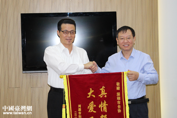 會上,謝昉柱對深圳市臺協(xié)熱心幫扶扶貧掛鉤點貧困家庭的資助表示感謝,并代表受助的兩戶貧困戶轉(zhuǎn)交了給深圳市臺協(xié)的感謝錦旗。