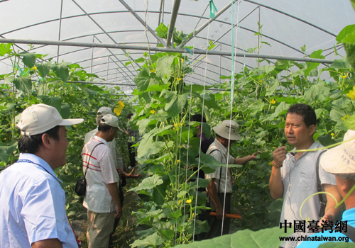 考察團(tuán)一行在東興鎮(zhèn)松柏村參觀大棚蔬菜基地,松柏村菜農(nóng)在向臺灣客人講解。(圖片來源:防城港市臺辦)