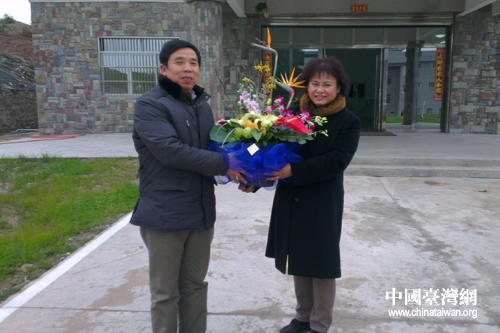 桂林市臺辦主任劉漢軍(左)向臺資長信公司贈送花藍(lán)。(圖片來源:桂林市臺辦)
