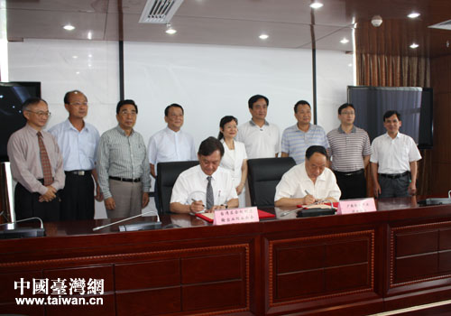 廣西林業(yè)產(chǎn)業(yè)行業(yè)協(xié)會(huì)與臺(tái)灣合板制造輸出同業(yè)公會(huì)簽訂合作備忘錄。(圖片來源:廣西臺(tái)辦)