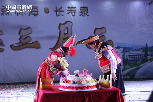 晚會(huì)上,兩岸同胞見證了臺(tái)灣花蓮縣光復(fù)鄉(xiāng)鄉(xiāng)長謝忠淵及夫人陳麗華50年的愛情故事。在南鄉(xiāng)林!らL壽溫泉旁,他們?yōu)檫@對(duì)金婚夫婦舉辦了一場(chǎng)壯族婚禮,讓謝忠淵夫婦穿上壯族婚禮盛裝,按照壯族婚禮的儀式,接受大家的祝福,鮮花綻放、禮炮齊鳴。
