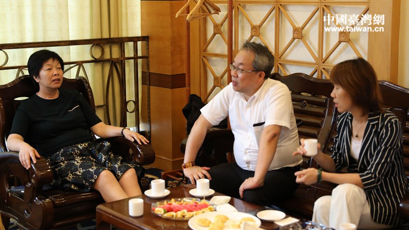 賀州市委常委、統(tǒng)戰(zhàn)部部長(zhǎng)唐敬春(左一)與臺(tái)灣兩岸青年農(nóng)業(yè)交流總會(huì)理事長(zhǎng)張茂林(中)會(huì)談。(圖片來(lái)源:廣西賀州市臺(tái)辦)