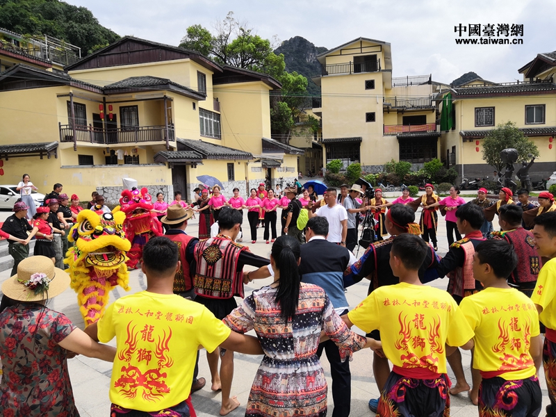 兩地鄉(xiāng)親拉手圍同心圓共跳同心舞(圖片來源:廣西桂林市臺辦)