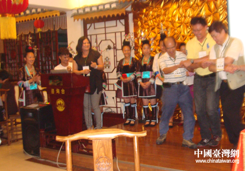 臺灣客商與榕江縣侗家姑娘進行歌舞互動表演。(圖片來源:榕江縣臺辦)