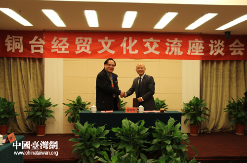 中國(guó)臺(tái)灣網(wǎng)12月31日消息 日前,銅臺(tái)經(jīng)貿(mào)文化交流座談會(huì)在銅仁南長(zhǎng)城大酒店召開(kāi),就進(jìn)一步加強(qiáng)銅臺(tái)經(jīng)貿(mào)合作展開(kāi)交流。貴州省委統(tǒng)戰(zhàn)部副部長(zhǎng)、省臺(tái)辦主任周素平,銅仁市委常委、市政府常務(wù)副市長(zhǎng)宗文出席座談會(huì)并講話(huà),市政府常務(wù)副秘書(shū)長(zhǎng)李明剛主持。