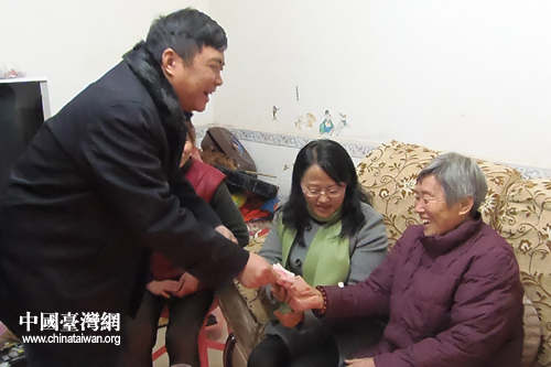 中國(guó)臺(tái)灣網(wǎng)1月10日消息 2013年元月7日,貴州省臺(tái)聯(lián)會(huì)長(zhǎng)邱培聲、副巡視員周飛月在安順市臺(tái)辦副主任帥開(kāi)立陪同下,到普定縣慰問(wèn)臺(tái)胞,對(duì)臺(tái)胞肖錦恒遺霜雷玉華、其女兒(下崗職工)肖慧蓉進(jìn)行慰問(wèn)。