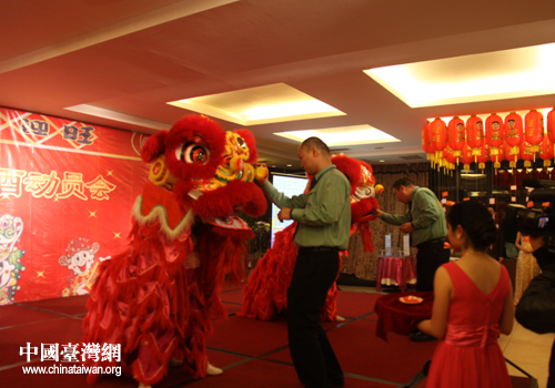 分公司負(fù)責(zé)人為即將登場(chǎng)的彩獅添上點(diǎn)睛之筆。(貴陽(yáng)市臺(tái)辦 段小芬 攝)