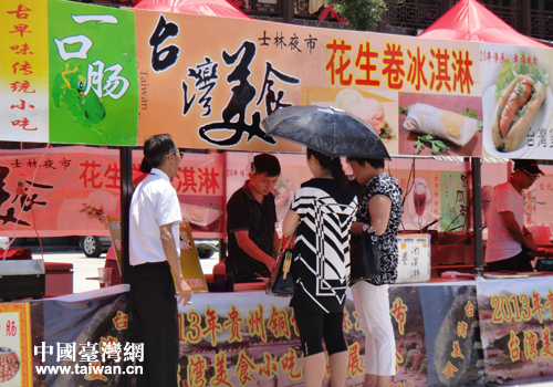 游客在展銷會上品嘗臺灣特色小吃。(圖片來源:銅仁市臺辦)