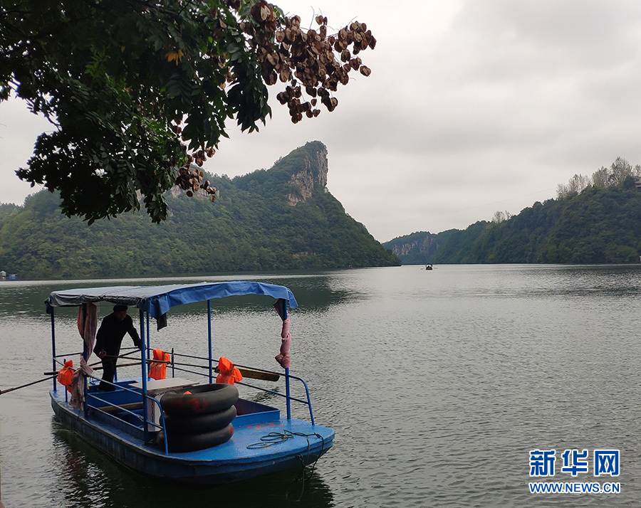 10月6日,鎮(zhèn)山村一位村民將游船劃回碼頭。新華網(wǎng) 黃勇 攝
