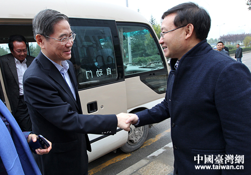 貴陽市委常委、統(tǒng)戰(zhàn)部長(zhǎng)帥文(右一)迎接國(guó)務(wù)院臺(tái)辦張志軍主任。(當(dāng)代貴州雜志社 傅泊霖 攝)