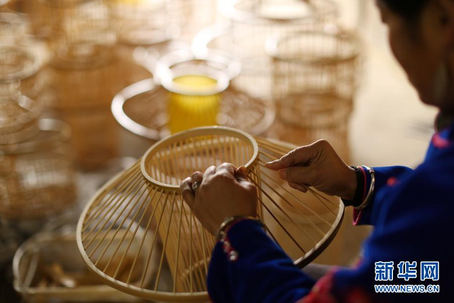 12月25日,村民在貴州省丹寨縣龍泉鎮(zhèn)卡拉村一家竹編作坊制作竹編特色燈具。