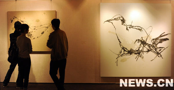 10月10日,觀眾觀看葉永青的繪畫作品。當(dāng)天,臺(tái)北寒舍空間與大陸知名畫家葉永青合作舉辦的大型個(gè)展“畫·涂——葉永青精品收藏展”在臺(tái)北開展,14幅葉永青繪畫精品參展。新華社發(fā)(吳景騰 攝)