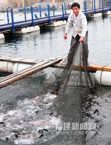 1月4日,一位連江漁民正在還上養(yǎng)殖漁排收網(wǎng)。據(jù)福建省海洋與漁業(yè)廳透露,2009年福建省對(duì)臺(tái)水產(chǎn)品出口創(chuàng)歷史新高,僅前11個(gè)月對(duì)臺(tái)水產(chǎn)品出口3.55萬(wàn)噸,創(chuàng)匯2.08億美元,出口量、出口金額均居大陸各省首位。(張麗君 攝)