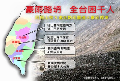強(qiáng)大豪雨整夜下不停,阿里山單日雨量至昨天深夜11時(shí)已有297.5毫米,遠(yuǎn)遠(yuǎn)突破了250毫米警戒線(xiàn),創(chuàng)“八八風(fēng)災(zāi)”之后的最高。阿里山公路一旁山坡經(jīng)不起連夜豪雨沖刷,土石松動(dòng)沖到路面,將兩線(xiàn)道路掩埋成一線(xiàn)道,還有出租車(chē)為了閃躲大石,左邊輪胎不慎卡在水溝,動(dòng)彈不得。