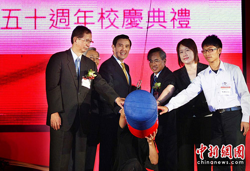 6月1日,臺灣領導人馬英九出席臺北醫(yī)學大學50周年校慶典禮活動。據(jù)悉,這所大學建校以來培養(yǎng)出3萬多名優(yōu)秀人才,辦學中學校注重培養(yǎng)學生的人文素養(yǎng)和社會責任感。中新社發(fā) 宋吉河 攝