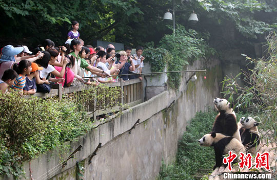7月29日,受中共四川省委書記劉奇葆邀請(qǐng),由臺(tái)灣民意代表馬文君率領(lǐng)的126名臺(tái)灣“9·21”大地震災(zāi)區(qū)和“8·8”風(fēng)災(zāi)災(zāi)區(qū)的學(xué)生來到成都大熊貓繁育研究基地,與大熊貓近距離接觸中新社發(fā) 劉忠俊 攝