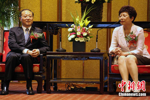 臺灣海峽兩岸觀光旅游協(xié)會會長賴瑟珍(右)在圓山大飯店歡迎邵琪偉一行。中新社發(fā) 劉舒凌 攝