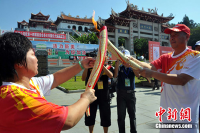 來自兩岸的火炬手在湄洲傳遞福建省第十四屆運(yùn)動(dòng)會(huì)火炬。 林劍冰 攝