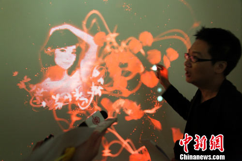 以鄧麗君為主題的臺北花博“名人館”,10月6日首次向媒體公開。圖為展館重頭戲“花語廳”內(nèi)設(shè)置的“落英繽紛”藝術(shù)裝置,可讓多位參觀者同時(shí)伸手掬起一朵朵鄧麗君生前最喜愛的玫瑰花(數(shù)碼模擬),使其累積疊加,幻化成鄧麗君令人懷念的容貌。