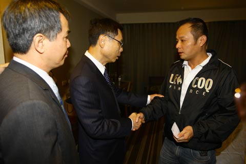 海基會副董事長高孔廉(中)3日前往臺北縣深坑福容飯店,慰問蘇花坍方意外的大陸游客家屬!爸醒肷纭眻D