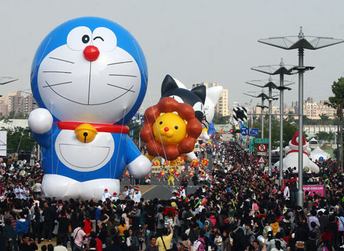 2011年高雄跨年晚會(huì)系列活動(dòng)“大氣球游行”25日在高雄市時(shí)代大道舉行,現(xiàn)場(chǎng)有小朋友喜愛的卡通人物如哆啦A夢(mèng)、海綿寶寶等參與游行,氣氛熱鬧。圖片來源:“中央社”