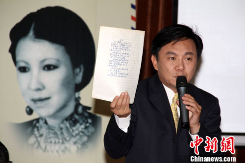 1月4日,臺灣女作家三毛生前摯友眭澔平在北京舉行新書《三毛的最后一封信》發(fā)布會。當天是三毛逝世20周年紀念日,眭澔平在現(xiàn)場回憶了諸多往事,還展示了三毛在離世前幾天為他留下的信件、電話錄音、生前遺物等。該書接續(xù)了三毛在文學(xué)、音樂和旅行上的夢想,用20年的時光、20個三毛的故事、20首紀念三毛的歌曲、20段三毛塵封的錄音、20幅為三毛創(chuàng)作的畫卷以及20年180多個國家的旅行記錄,為天堂中的三毛寄出了一封回信。圖為眭澔平展示三毛珍貴的手稿,是她寫《滾滾紅塵》的前言。