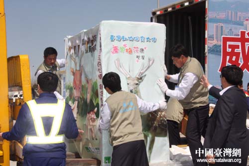 下午14點20分,迎接臺灣贈大陸梅花鹿和長鬃山羊的車隊從機場返回威海市,車隊到達劉公島外旅游碼頭后,兩輛動物運輸車駛上登陸艦,相關人員乘旅游船,隨后,負責引導的海事船和登陸艦、旅游船組成船艦編隊駛向劉公島。