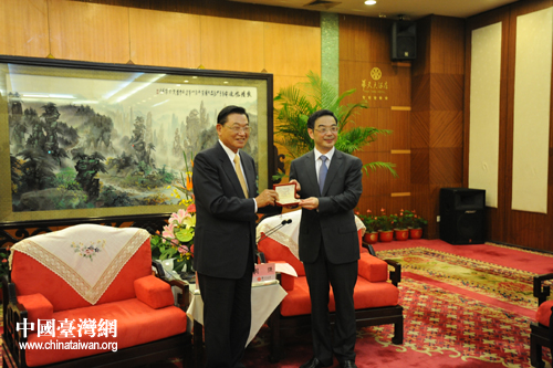 湖南省委書(shū)記周強(qiáng)、海協(xié)會(huì)會(huì)長(zhǎng)陳云林會(huì)見(jiàn);鶗(huì)董事長(zhǎng)江丙坤及;鶗(huì)媒體參訪團(tuán)一行。(湖南省臺(tái)辦 王敏杰 攝)