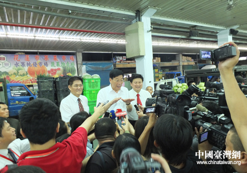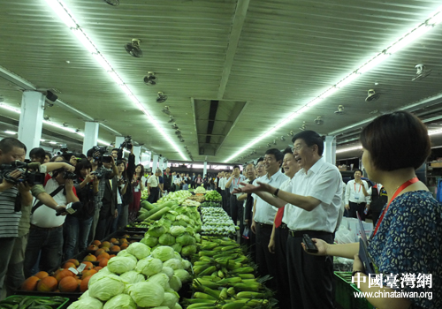 湖南省委副書記、省長(zhǎng)徐守盛在花蓮縣縣長(zhǎng)傅崐萁陪同下參觀花蓮縣吉安果菜市場(chǎng)。(圖片來源:湖南省臺(tái)辦)