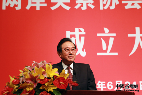 6月24日上午,海峽兩岸關(guān)系協(xié)會(huì)書畫交流分會(huì)成立大會(huì)在北京釣魚臺(tái)國(guó)賓館舉行。圖為海峽兩岸關(guān)系協(xié)會(huì)會(huì)長(zhǎng)陳云林在成立大會(huì)上致辭。(中國(guó)臺(tái)灣網(wǎng) 于斯文 攝)