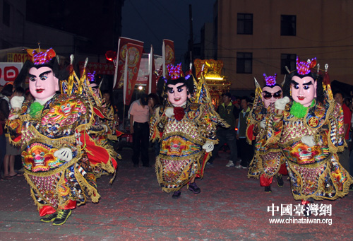 紅遍兩岸的“電音三太子”在巡游途中跳起時(shí)下正流行的《江南style》。(中國臺(tái)灣網(wǎng) 李典典 攝)