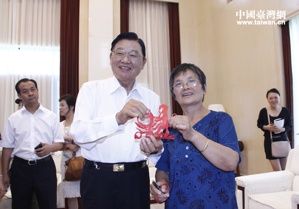 23日,首屆兩岸和諧家庭合唱節(jié)在遼寧省鐵嶺市隆重開幕。臺灣三三會會長、前海基會董事長江丙坤率團參加活動。圖為江丙坤在參觀民間剪紙藝術時獲鐵嶺市非遺產(chǎn)文化傳承人,有名的剪紙藝人艾玉芹贈送寓意好運的福猴抱桃剪紙貼畫。(中國臺灣網(wǎng) 普燕 攝)
