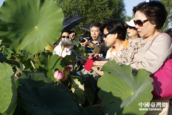 臺灣雅樂合唱團參觀蓮花湖濕地公園中的怡荷園時,與最盛時能有三千多花瓣的名品荷花留影。(中國臺灣網(wǎng) 普燕 攝)