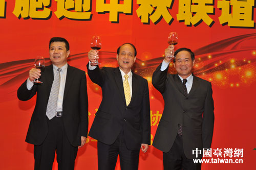 北京市臺辦主任汪明浩(左)、臺灣;鶗麻L林中森(中)和北京臺資企業(yè)協(xié)會理事長林清發(fā)向京臺兩地嘉賓祝酒(孟福祥 攝)