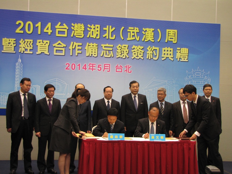 2014臺(tái)灣·湖北(武漢)周活動(dòng)啟動(dòng)儀式上,湖北省商務(wù)部門與臺(tái)灣貿(mào)易中心簽署合作備忘。吳亞明攝