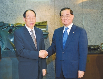 九日,福建省委書記尤權(quán)在臺(tái)北市會(huì)見中國(guó)國(guó)民黨榮譽(yù)主席連戰(zhàn)。張永定攝