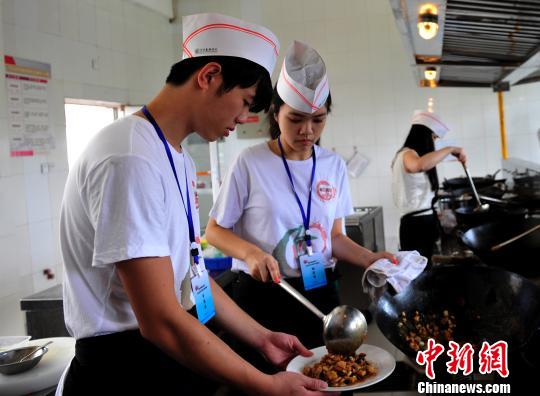 中新網(wǎng)成都7月23日電 (付敬懿 安源)“這盤菜取名百年修得同船渡,象征著臺(tái)灣和大陸同學(xué)的友誼!敝钢媲暗亩缃非炎樱_(tái)灣淡江大學(xué)的林書耘說(shuō),川菜體驗(yàn)營(yíng)里四天的相處,讓他與四川的大學(xué)生建立起深厚的友誼。23日,20名川臺(tái)兩地大學(xué)生頭戴白色廚師帽,腰系黑色圍裙,在四川旅游學(xué)院教室里以廚會(huì)友,展開一場(chǎng)“我是廚師我最牛”的廚藝比賽。同學(xué)們先要完成宮保雞丁、鐘水餃兩個(gè)指定菜肴,再利用廚房的各類食材,自由發(fā)揮做出三道美食。
